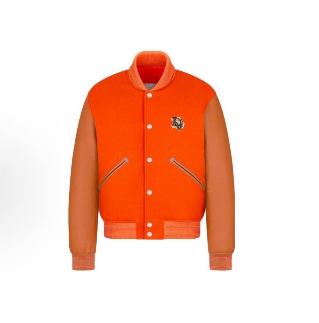 Бомбер Dior в яскраво-помаранчевому кольорі з шкіряними рукавами і вишитим логотипом. Класичний силует varsity з фірмовим стилем будинку Dior.